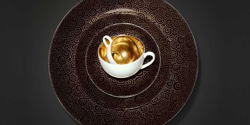 Декоры фарфора Dibbern никогда не перекрывают красоту белой гладкой поверхности костяного фарфора, они всегда деликатны. Следует этому правилу и декор Ornament черное золото. Ornament черное золото -элегантный, восточный орнамент золота на черном фоне.